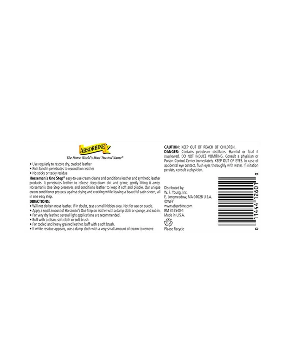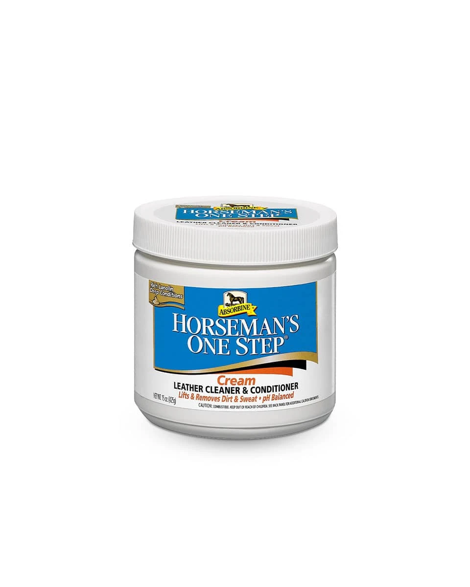 Horseman’s One Step from Absorbine combines three powerful cleansers for a deep, restorative cleaning. Effective with both natural and synthetic leathers, Horseman’s One Step brings out that natural leather glow while removing all the dirt, sweat, and salt without leaving any greasy residue.