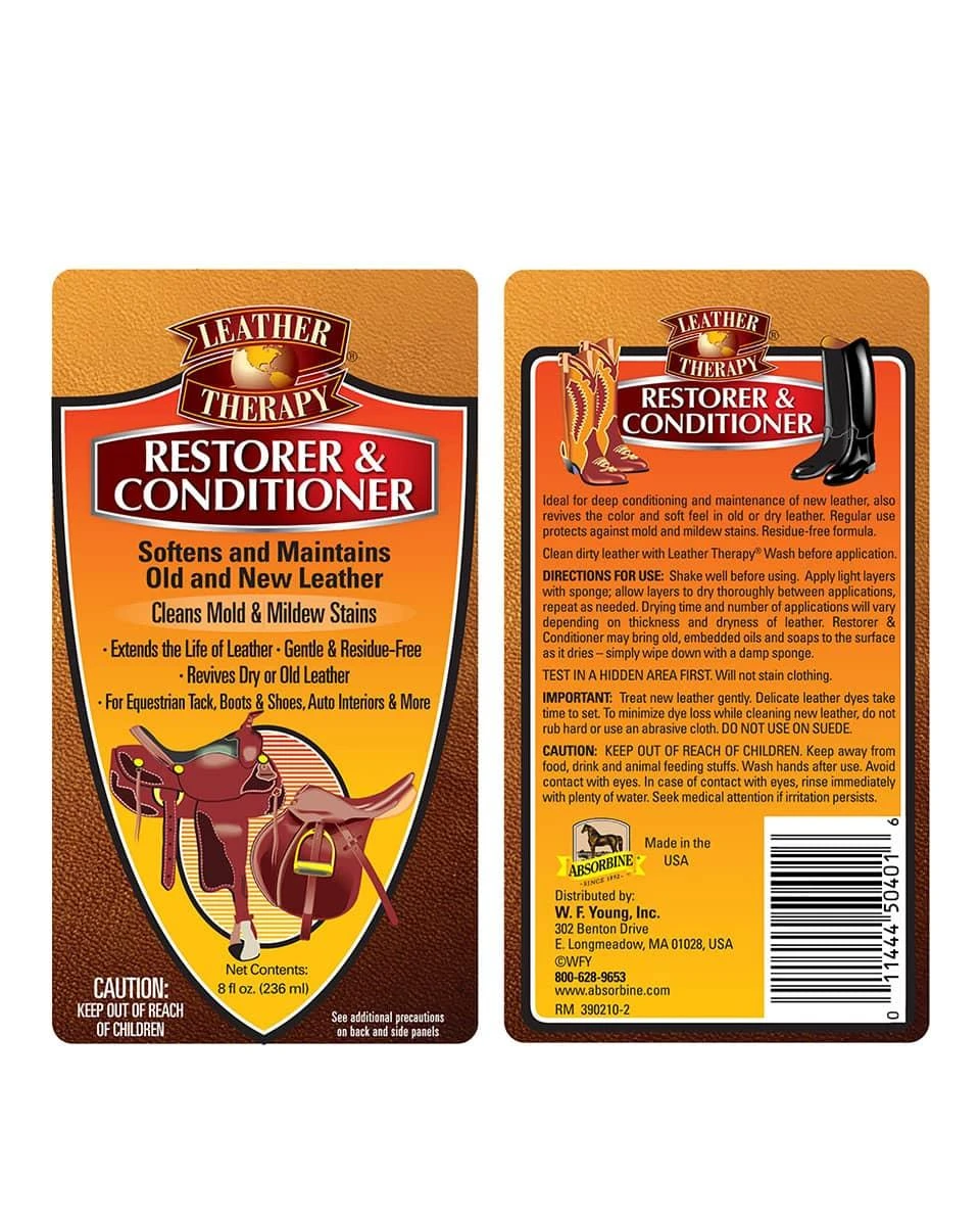 Leather Therapy Restorer and Conditioner by Absorbine extends the life of your leather tack products by bringing a deep clean that lifts damaging oils and soaps from the inner fibers of your leather. This deep conditioner will bring back the original life, color, and feel of your leathers and synthetics. Regular use also helps prevent mildew and mold.