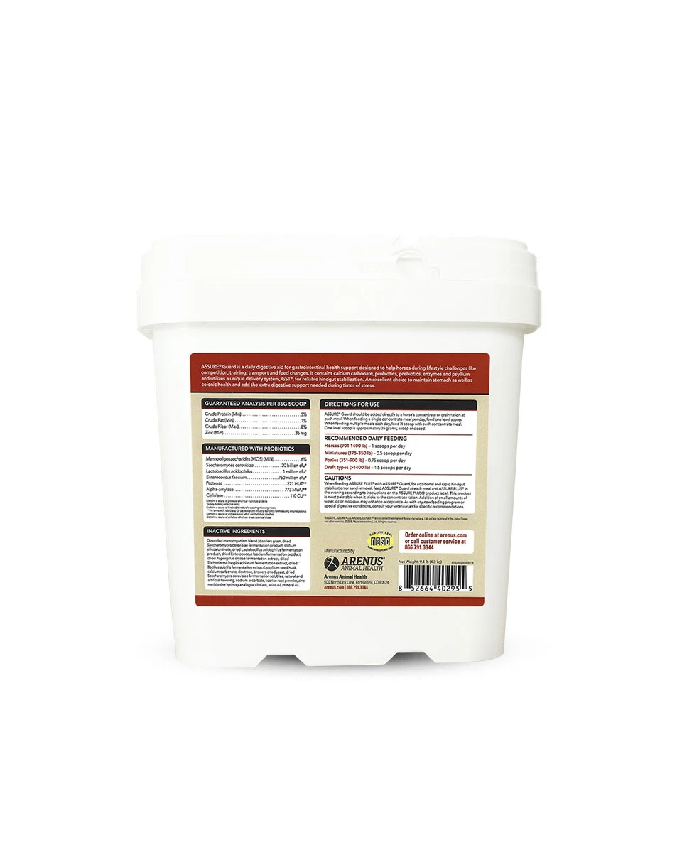 Assure Guard by Arenus is a daily digestive aid for gastrointestinal health and hind-gut support and maintenance. Designed for horses facing challenges that come with competition, training, travel, and dietary changes, Assure Guard provides the best nutrients to keep your horse’s stomach balanced with the proper pH levels and a healthy digestive tract. Assure Guard is formulated to limit colic, diarrhea, and weight loss and promote optimal digestive function. The addition of calcium carbonate also helps soothe colonic ulcers. Addressing these problems with Assure Guard will enhance your horse’s energy level and mood to ensure the best performance.