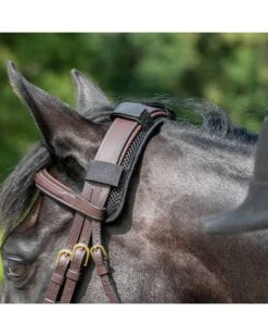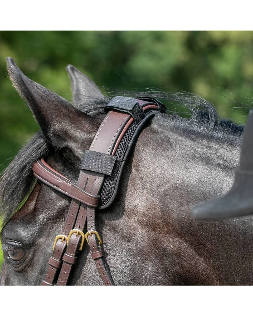 The Back on Track poll cover provides a padded barrier between the occipital protrusion at the back of the horse’s skull and the bridle/halter reducing or alleviating tension in the poll and the jaw.