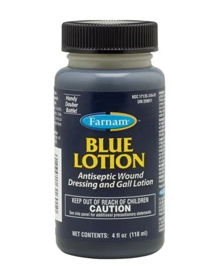 Farnam’s Blue Lotion is an antiseptic dressing that fights bacterial infections in your horse’s minor cuts and surface wounds. This quick-drying formula penetrates the skin to help treat skin abrasions and is easy to apply with the included dauber top.