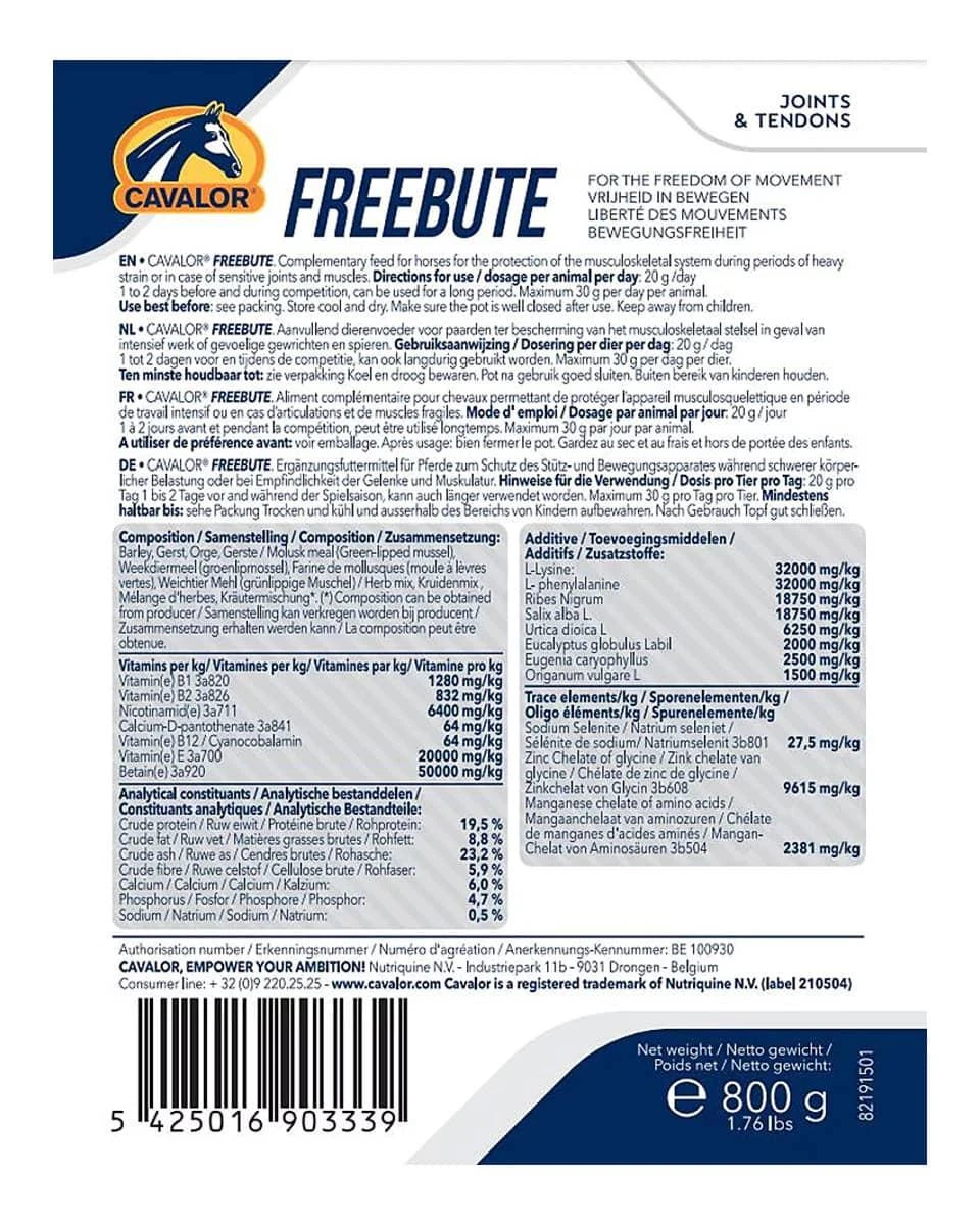 Cavalor FreeBute Powder is formulated with a blend of natural ingredients to support the muscles and joints of active horses. It helps prevent excessive inflammation, and is a great option for any horse that gets stiff after rides, is stiff due to aging, or just needs improved mobility for performance. This unique blend of herbs not only helps alleviate pain but also helps maintain supple muscles and joints. Unlike many other pain relievers, FreeBute contains only safe, natural ingredients and is gentle on their stomachs. The powder form makes this an easy-to-feed option for daily support for your horse.