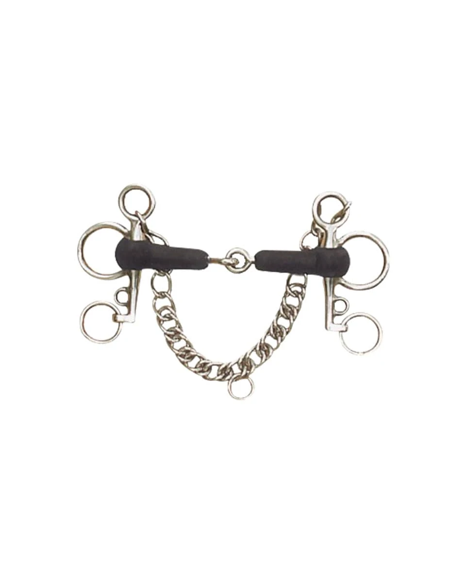 The Rubber Mouth Tom Thumb Pelham from Centaur is for the horse who requires a little extra leverage and features a soft rubber-covered mouthpiece for extra comfort. Because it is a tom thumb the shank is shorter, 4″ in length, and this is a single-jointed bit. Pelhams require a curb chain and curb rein to work properly. (curb rein sold separately) Centaur bits are perfectly balanced to protect your horse and your ride.