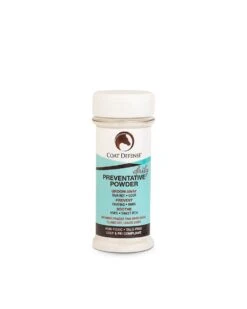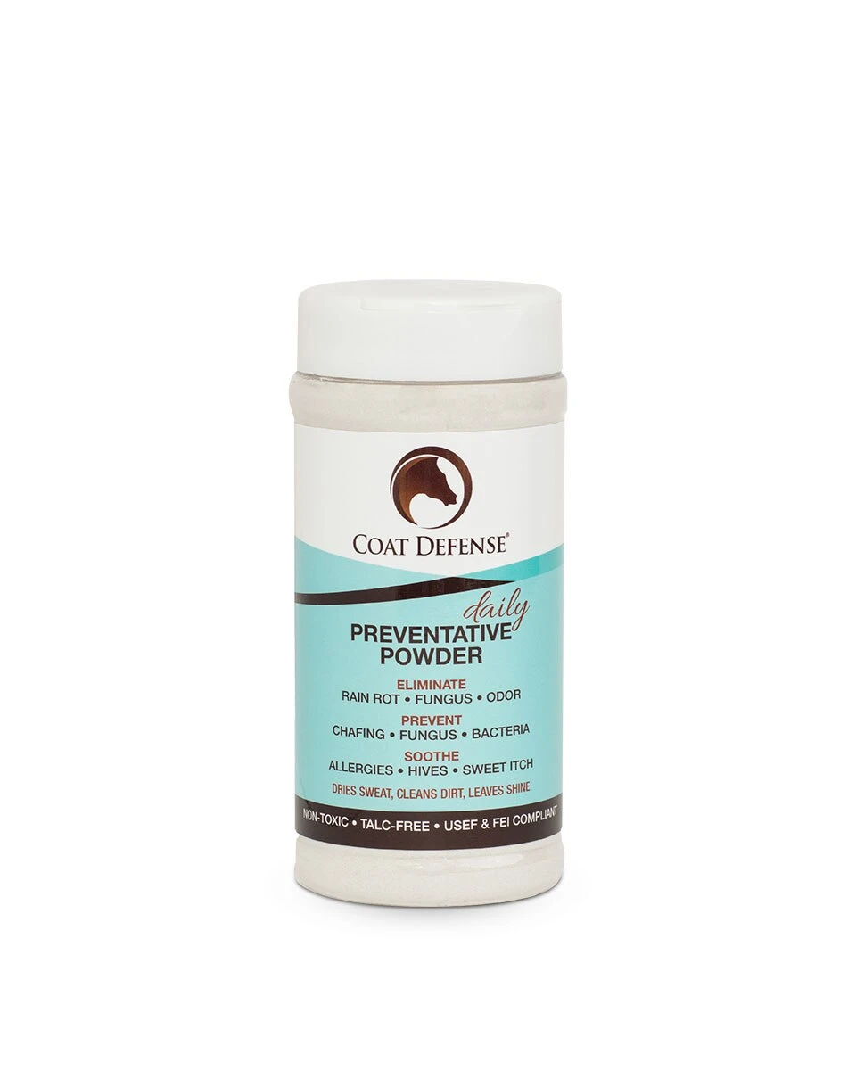 Coat Defense Daily Preventative Powder is an all-natural daily preventative powder that helps to treat and prevent your horse’s skin problems caused by fungus, rain rot, rubs and more. Daily Preventative Powder is powerful in treating skin ailments, but can also be used between shampoos to act as a sort of hair refresher or dry shampoo that helps wick sweat and keep equipment from causing uncomfortable rubbing.