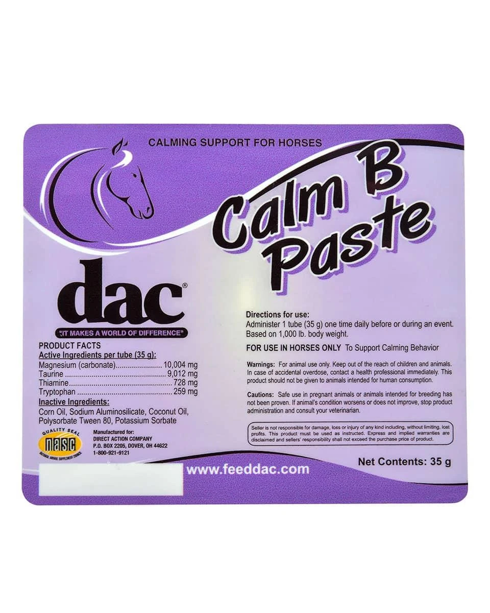 Dac Formula Calm B Paste (35gm) is made with a blend of b-vitamins like thiamine and pyridoxine that have a calming effect on your horse’s nervous system. This palatable paste is easy to administer and helps to increase serotonin levels for inhibition of aggression, fear and stress.