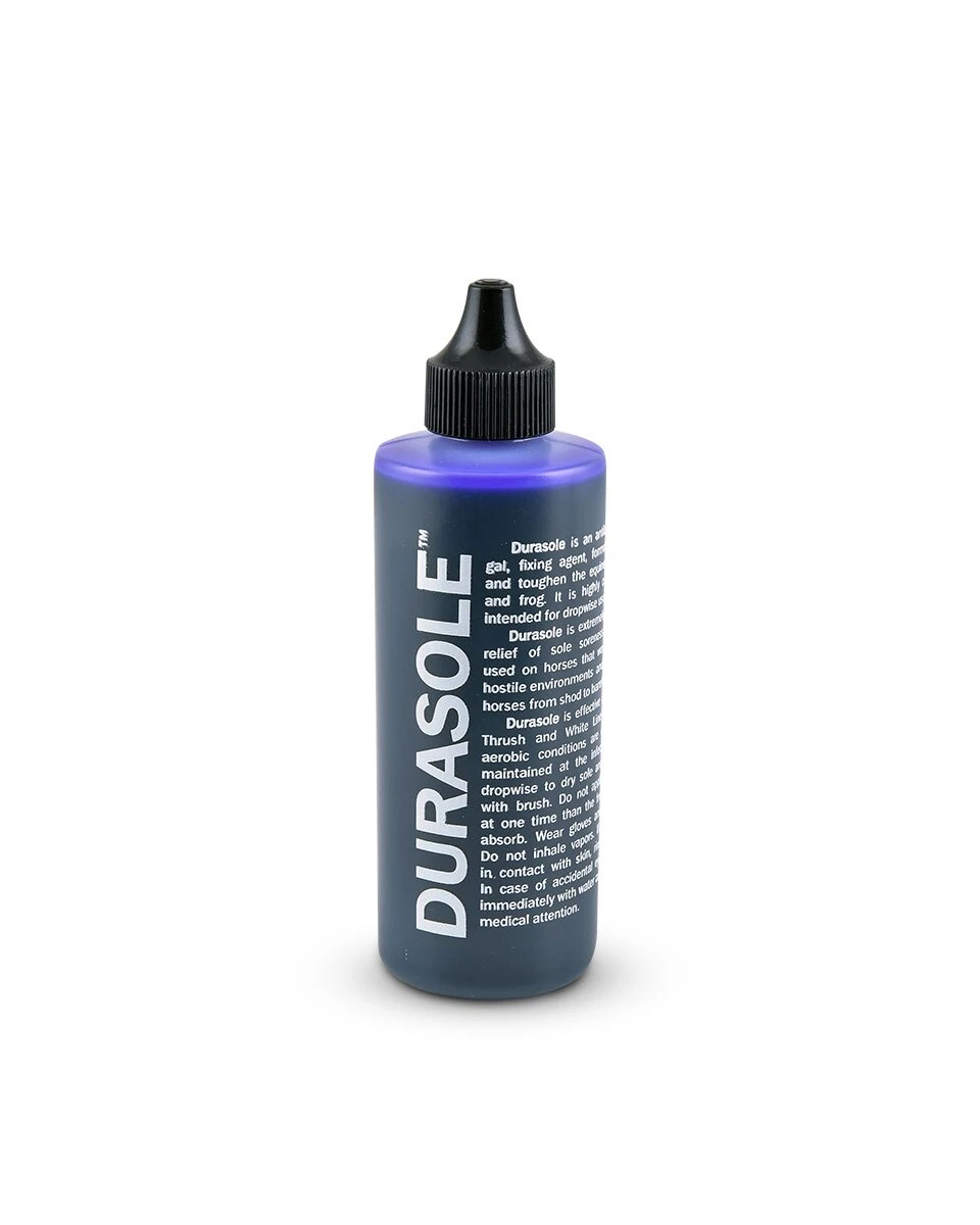 Durasole is a povidone-iodine based sole dressing formulated to harden the equine exfoliating sole and frog. It is extremely effective in enhancing the protective capabilities of those structures and does not affect the proximal sensitive sole or frog. It works by swelling and thickening the cell membranes of the exfoliating sole, not by coating the sole with impermeable oils.