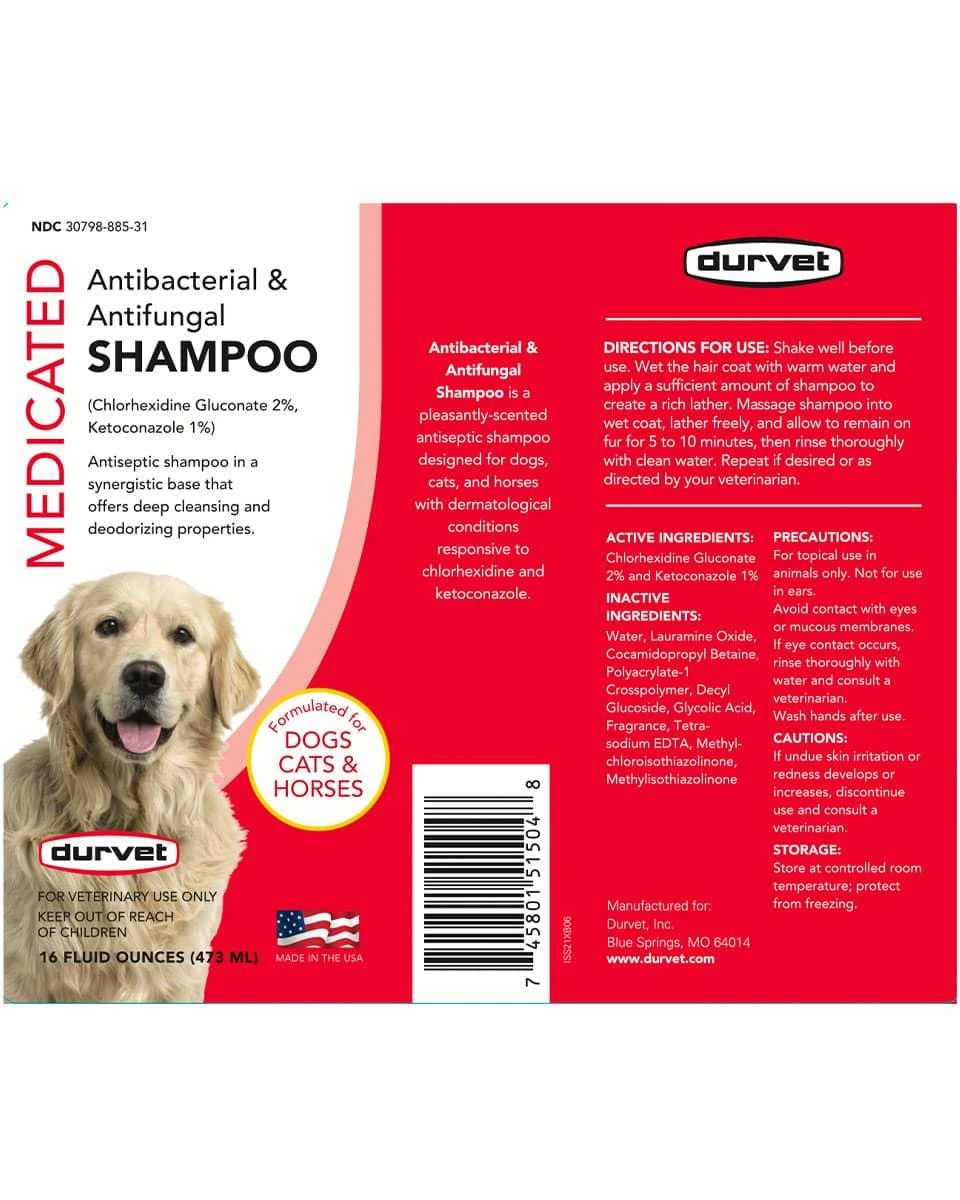 Durvet Medicated Antibacterial and Antifungal Shampoo is an antiseptic shampoo for skin conditions in dogs, cats, and horses. Formulated with Chlorhexidine and Ketoconazole, this shampoo will aid in the treatment of both bacterial and fungal infections. It is pleasantly scented and a great multi-purpose medicated shampoo.