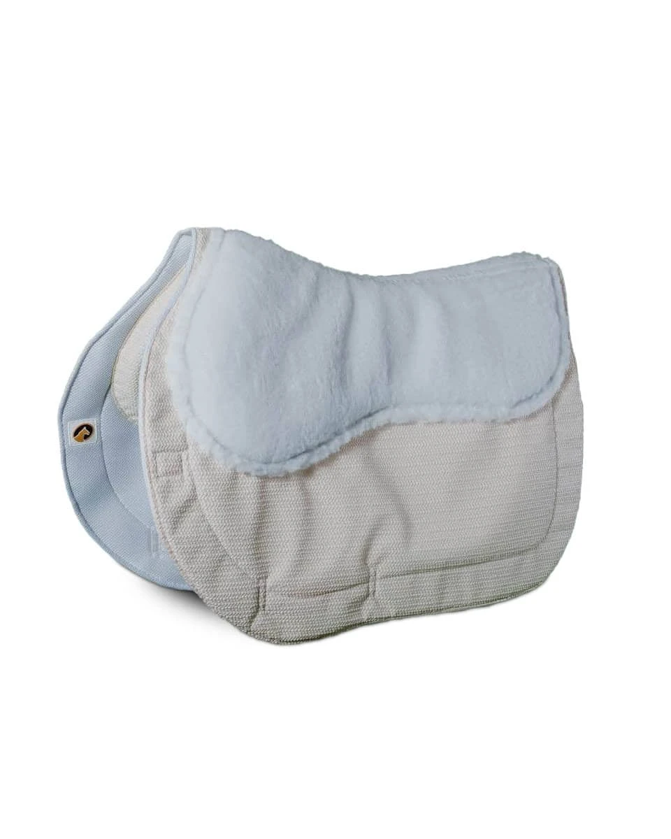 The Calmatech Jumper Saddle Pad from Ecogold was designed with the sensitive horse in mind – its fleece underside layered with high-impact foam offers maximum comfort and shock absorption. The Calmatech Medical Fleece reduces friction and pressure points on the horse’s back while providing soothing relief. The foam inserts are 100% breathable and fit into adjustable pockets for a custom saddle fit. This pad also has Ecogold’s non-slip system that is hypoallergenic and frictionless to keep the saddle securely in place while absorbing impact throughout the ride. The ergonomic design allows for close contact and a stable riding position.