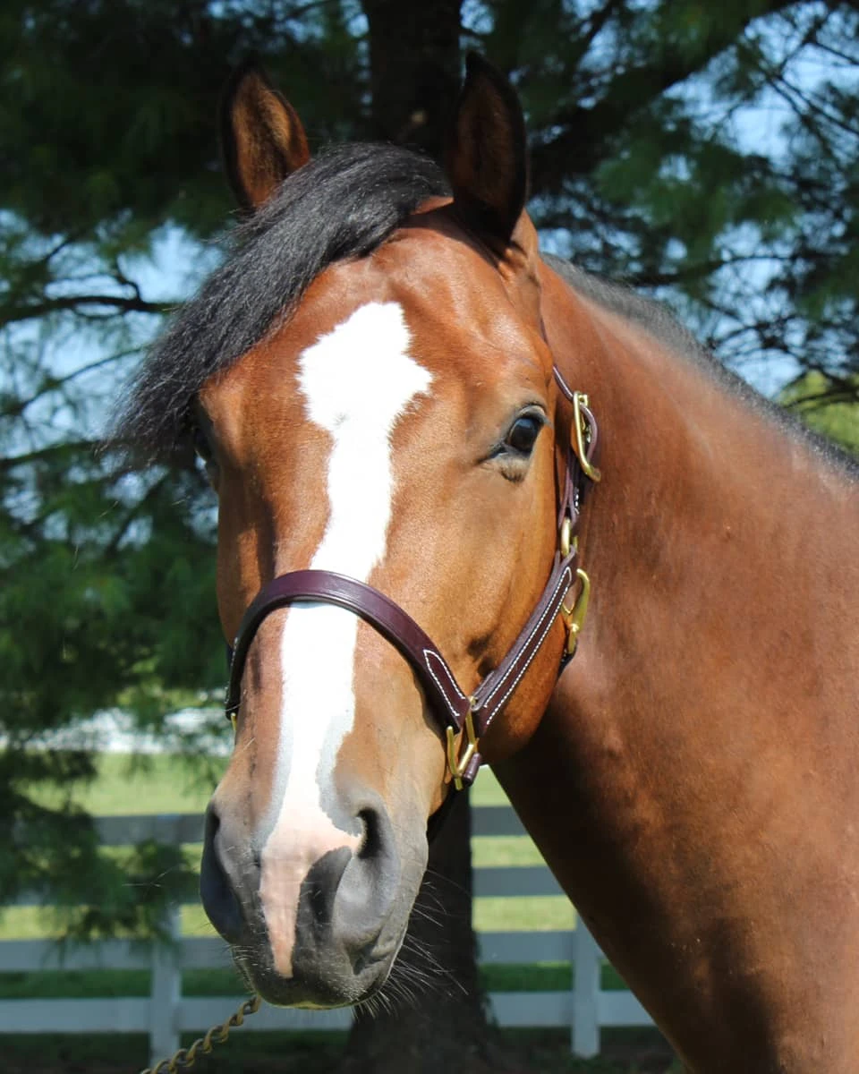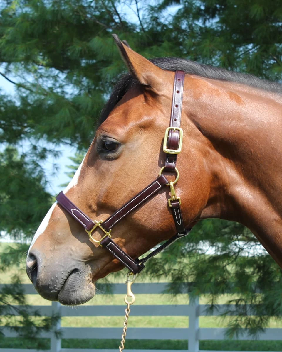 The FarmVet Heritage Halter by Walsh features high-quality Havana brown leather with a few signature touches. Designed with white thread, double-stitching, and all brass hardware, this halter embodies a classic style with standout details. Your horse will be the star of the show with a straight chin-piece and throat-latch snap made of solid brass. Add a custom Walsh brass name plate for a truly customized look! Available in sizes cob (6), horse (7), and oversize (8).