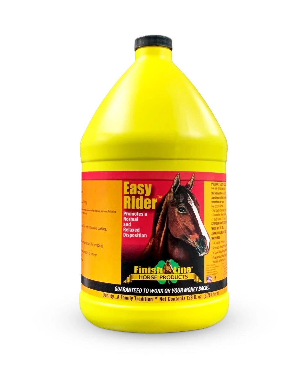 Easy Rider Calming Liquid Horse Supplement from Finish Line promotes mental alertness and relaxation without causing drowsiness allowing you to enjoy your ride every time. Formulated to tackle even the crankiest of horses, Easy Rider helps create a more gentle and agreeable disposition for mares, stallions, and geldings.