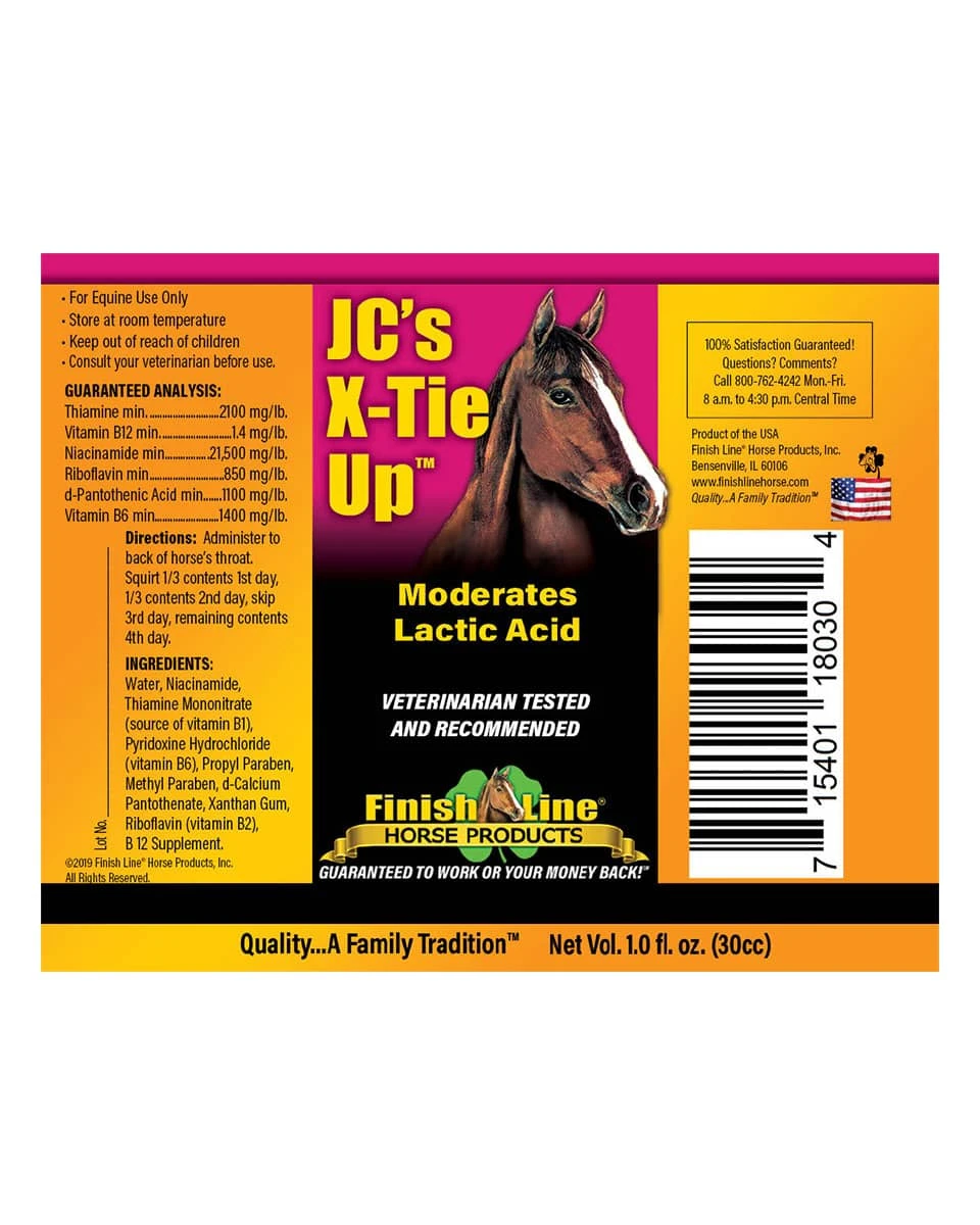JC’s X-Tie Up from Finish Line is an oral paste that offers muscle support for horses who suffer from cramps and episodes of exertional rhabdomyolysis (tying up). Use preventatively or during an episode to provide quick relief to your horse; the JC’s X-Tie Up will support healthy muscle function for up to 1 month after use. Each tube includes 3 doses of a proprietary blend of vitamins and has no side effects.Â