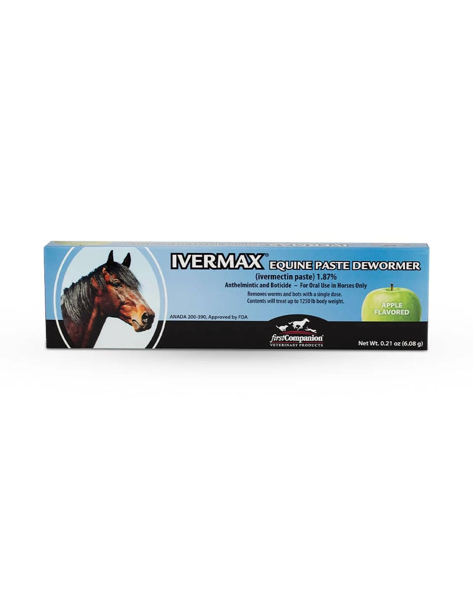 First Companion Ivermax Paste (Ivermectin) 1.87% is an equine wormer designed to control bots, large strongyles, small bloodworms, roundworms, threadworms, pinworms, lungworms, and large mouth stomach worms. One syringe will treat a horse that weighs up to 1,250 lb. Ivermectin 1.87% is safe for pregnant mares, breeding stallions, and any age of foal.