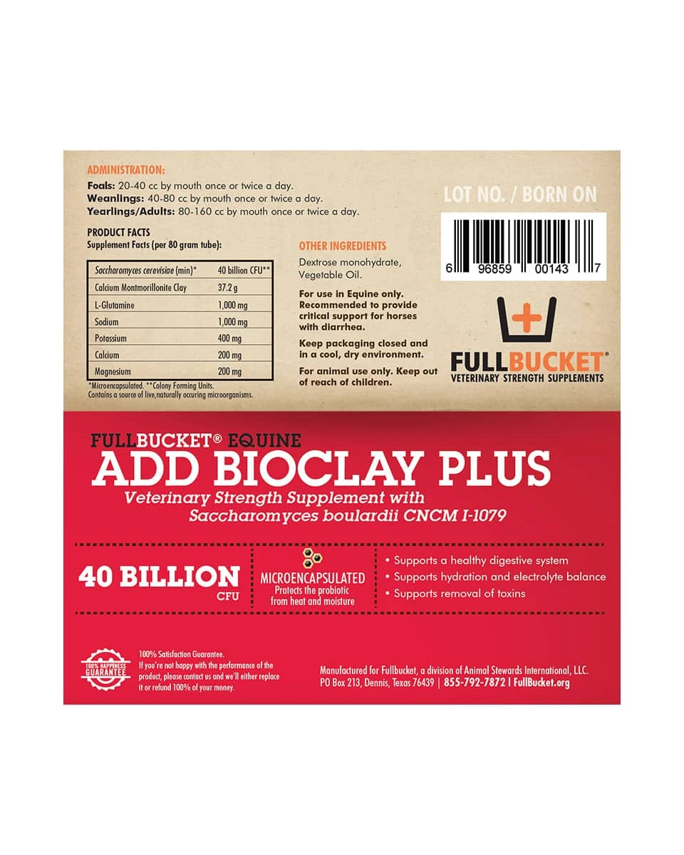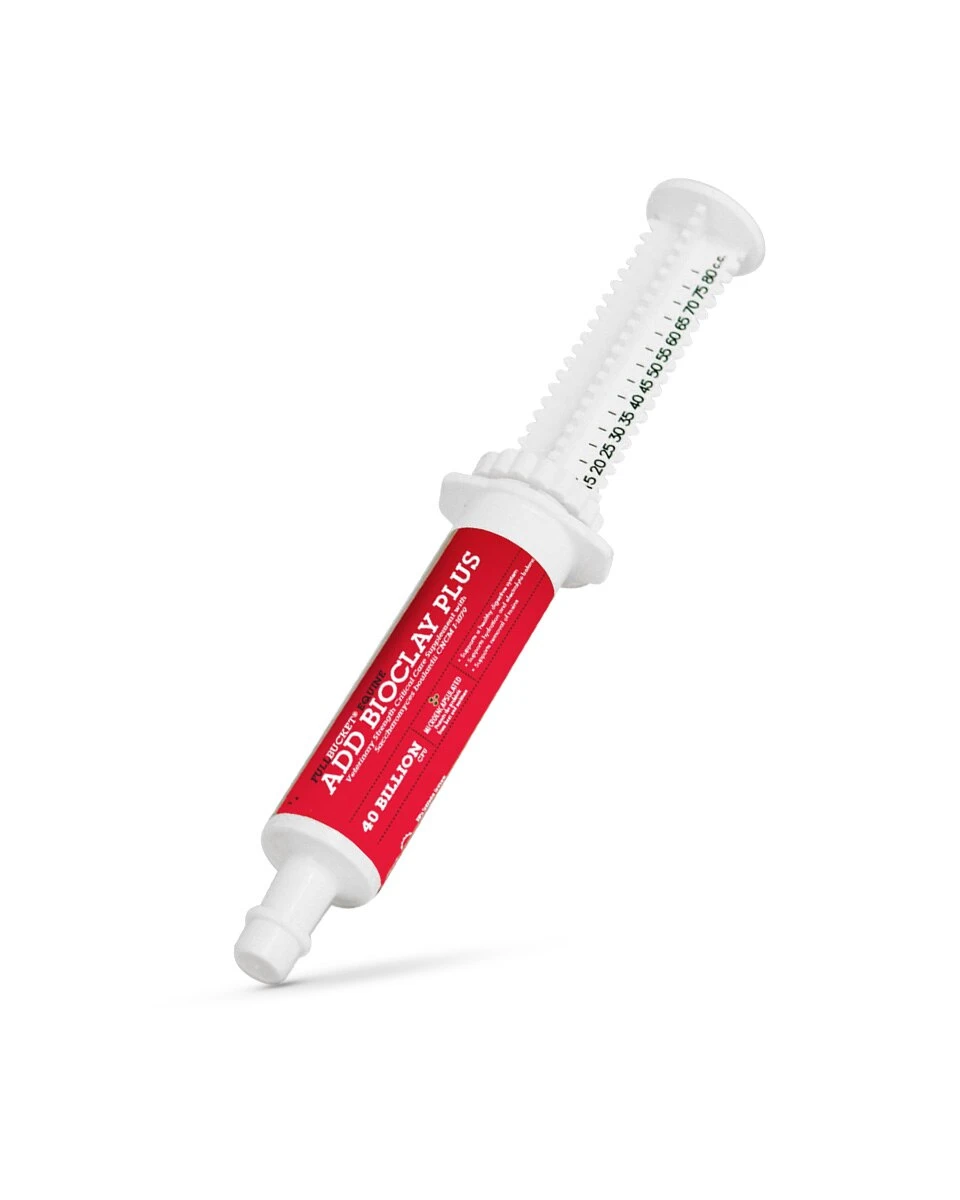 Equine ADD Paste Bioclay Plus Paste from FullBucket is an emergency veterinary formulated paste that provides relief to sick horses who are suffering from severe diarrhea. It is about 50% bio-adsorbent clay which helps to bind and remove toxins from the body. The paste also contains pre and probiotics to add “good” microbes into the gut as well as alert the immune system, causing pathogens to be carried out of the body or destroyed. Electrolytes are also a key ingredient to the paste, they start the re-hydration process. This paste is perfect for horses with acute colitis, impending colitis and horses that have just finished surgery.