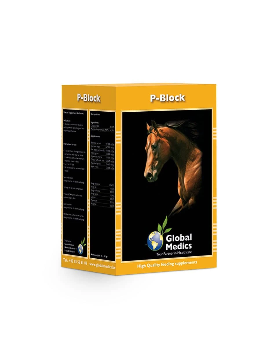 Global Medics P-Block Powder contains a unique mixture of herbs and antioxidants that provide strong analgesic effects for hard-working joints and muscles. P-Block is formulated specifically to provide relief and comfort to your horse on competition days to be sure they can perform at their best. This formula containing Boswellia Serrata, Curcuma Longa, and Pineapple Comosus is fast-acting and powerful with no doping substances, making it the perfect addition to your pre-showing routine.