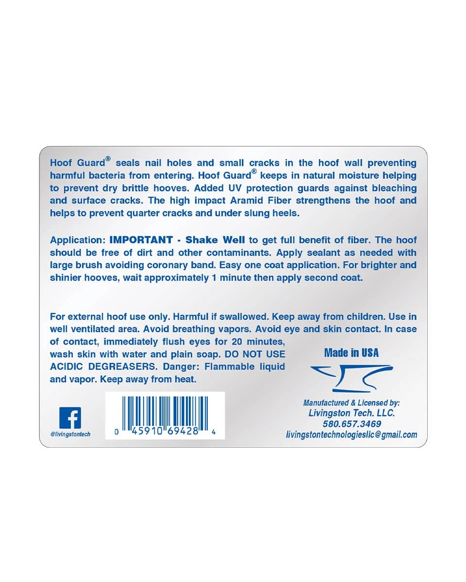 Hoof Guard Sealant by Livingston Tech is specifically made to seal nail holes and small cracks in your horse’s hoof wall to prevent harmful bacteria from entering and aid in stronger healthier hooves. Hoof Guard is a clear sealant with high-impact Aramid Fiver that helps keep in natural moisture while presenting quarter cracks and under slung heels.