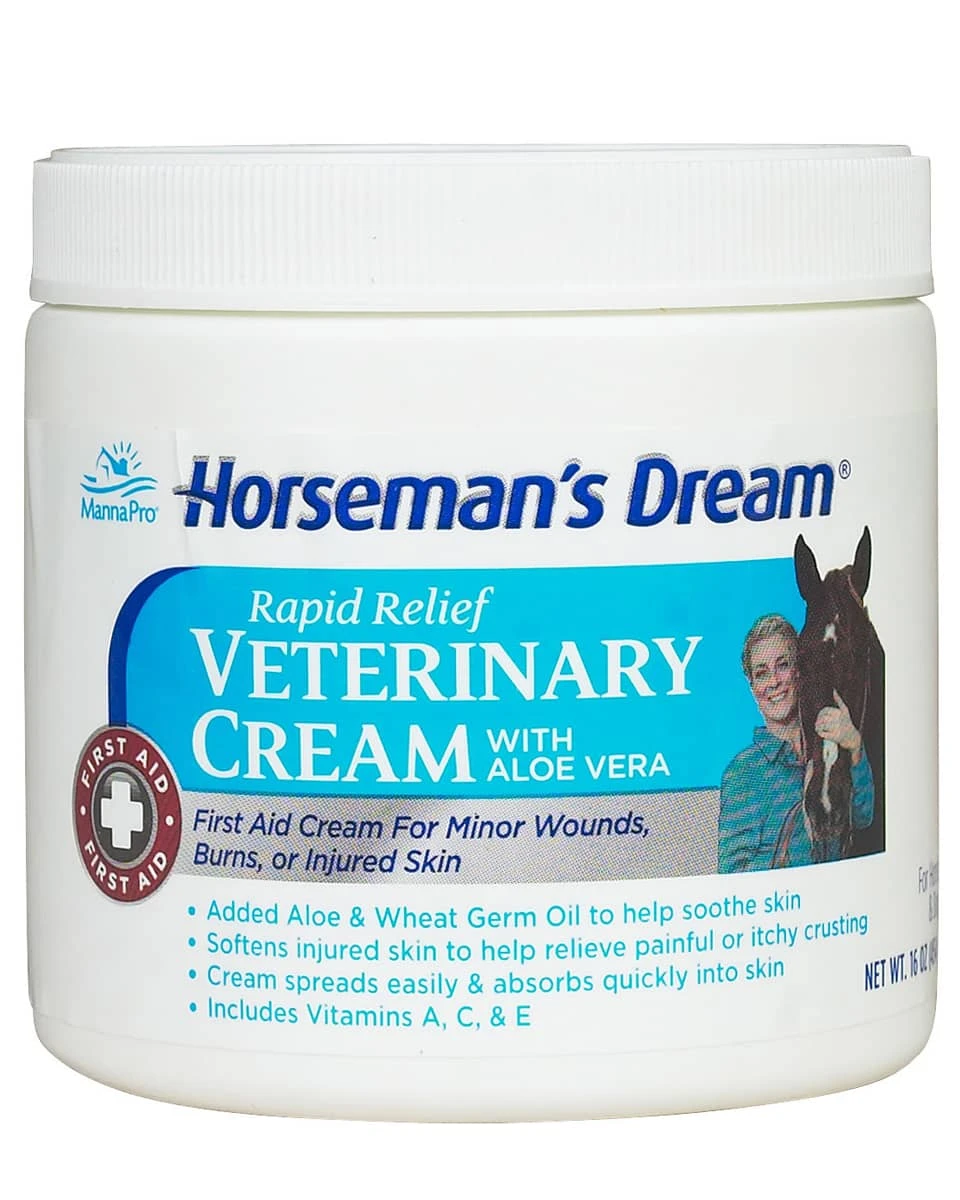 The Veterinary Cream from Horseman’s Dream (formerly Aloe Ointment) is a soothing first-aid cream for your horse that can be used on minor cuts and abrasions. It features both aloe vera and wheat germ oil, and is quickly absorbed into the skin, bringing rapid relief to your horse. It’s also made with vitamins A, C, and E and spreads easily onto the skin. This cream works well on other skin issues that need soothing moisture and relief, such as burns, rubs, and sunburn. It is safe to apply without using gloves.