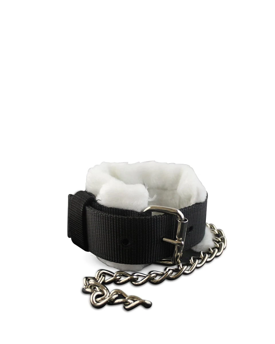 These heavy duty Kicking Chains are made with nylon webbing, fleece-lined padding and durable hardware. They rapidly help to teach the horse to stand quietly.