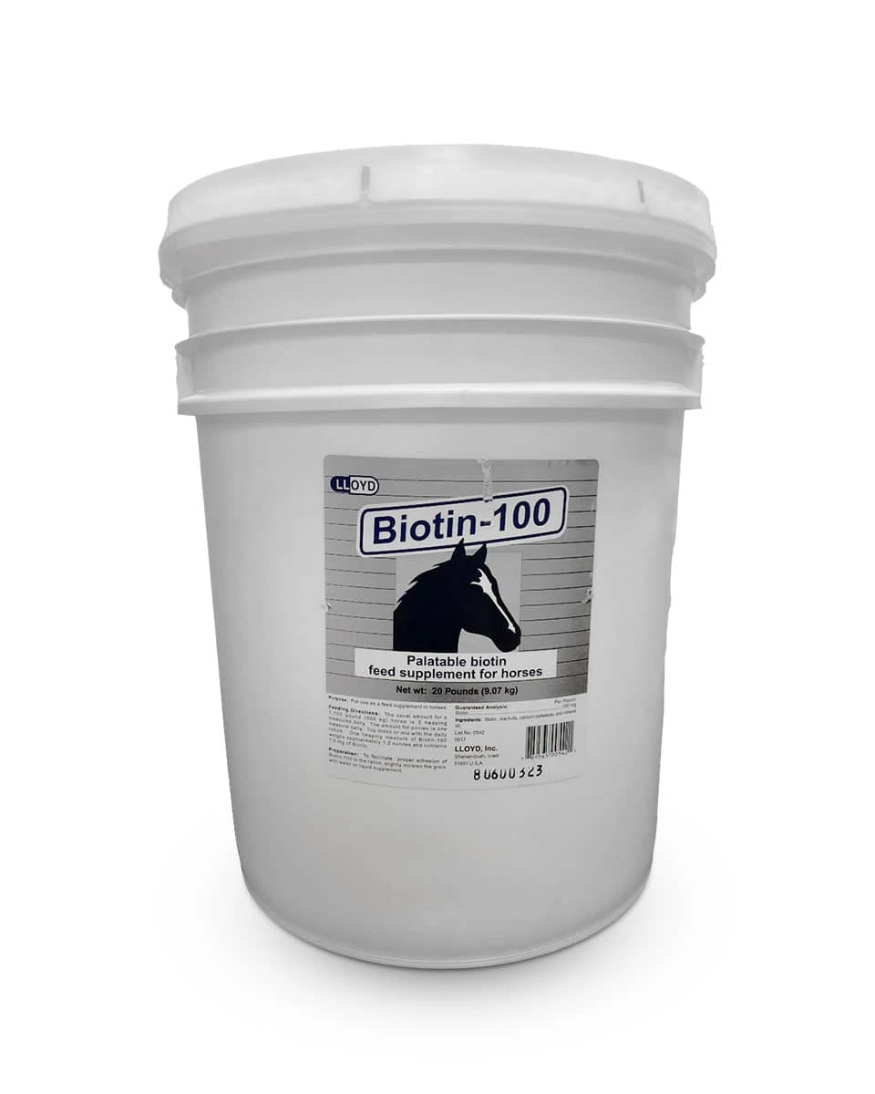 Lloyd Biotin-100 Powder provides an easy and economical way to supplement with biotin. Biotin is beneficial for improving hoof condition and growth. This easy-to-feed power is high quality and dosed specifically for horses. A 1/3 cup measure is included to ensure proper supplementation.