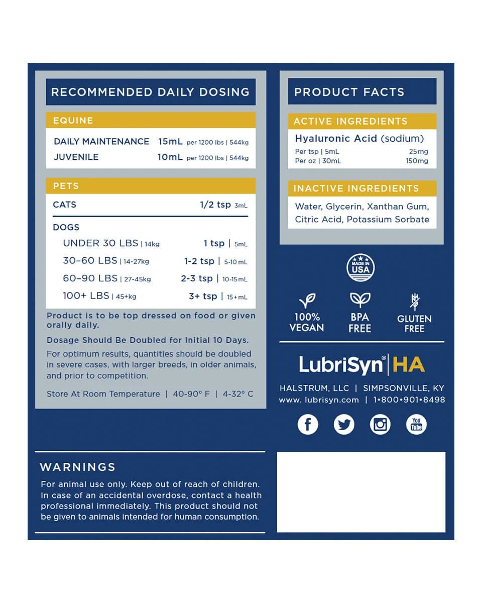 LubriSyn, Sodium Hyaluronate (HA) from Halstrum is the only patented oral HA for the treatment of joint pain and inflammation in horses and dogs. HA is the same glycosaminoglican found in synovial fluid, and the cartilage matrices, which cushion and lubricate articulating joints. Supplemental HA improves soundness and joint function.