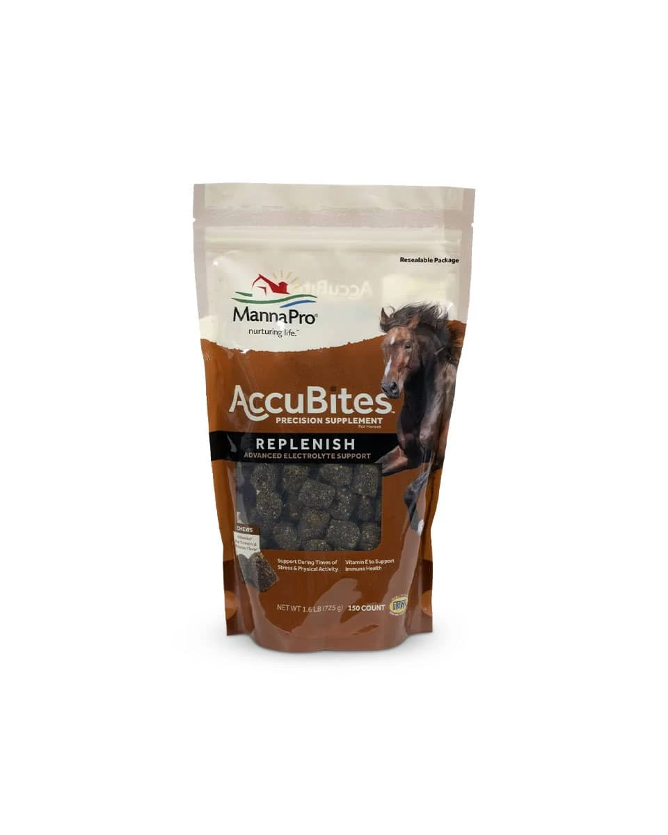 Manna Pro AccuBites Replenish is a convenient, carefully balanced combination of electrolytes and Vitamin E for immune health and electrolyte support for your horse during times of stress and physical activity.