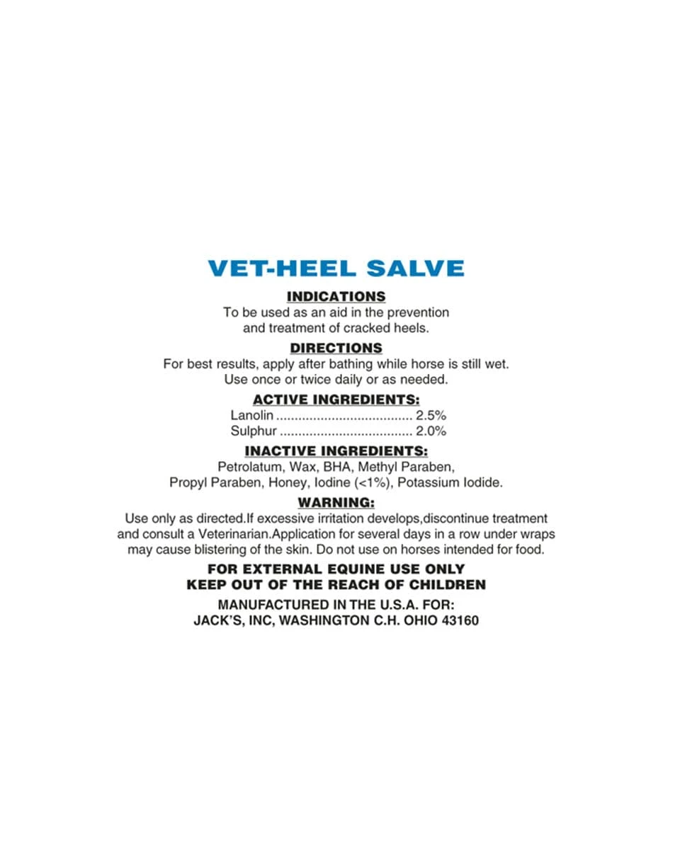 Vet-Heel Salve from McTarnahan’s is a moisturizing ointment intended to prevent and soothe cracked heels or other conditions on your horse caused by dryness and chaffing. Lanolin, sulphur, and honey combine to reduce irritation and restore your horse’s healthy, moisturized skin and coat. Horsemen have also found success using this product on ear warts.