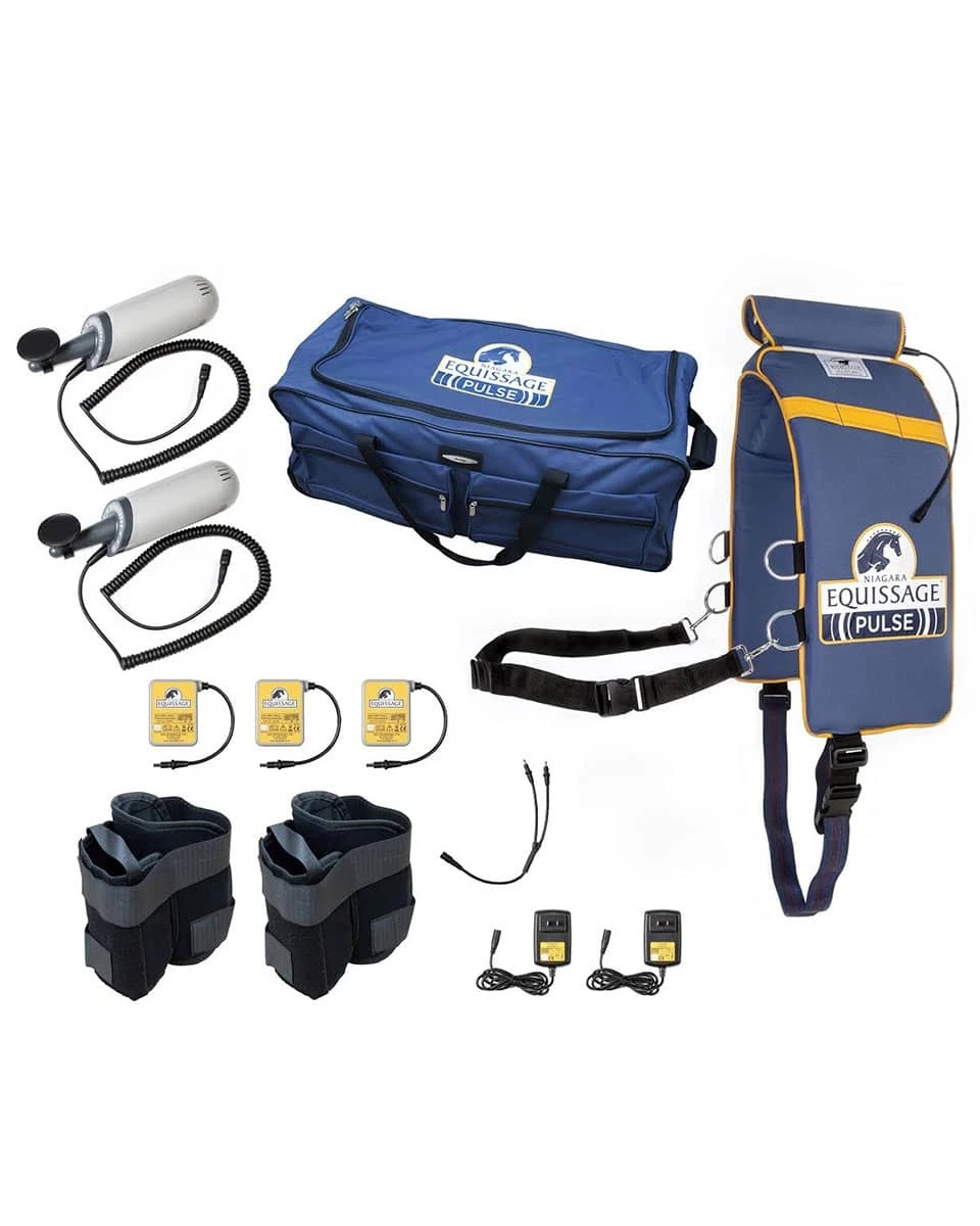 This all-in-one equine physio-therapy system delivers deep vibrations to improve circulation throughout your horse’s body. Better circulation allows your horse to clear lactic acid, heal quicker, and feel better before and after exercise. The Niagara Equissage Pulse also encourages lymphatic drainage, part of your horse’s natural immune system, and joint mobility. Non-invasive and comprehensively safe, this system fits any horse and works for any discipline. Whether cooling down or warming up, the Niagara Equissage Pulse promotes good health and quick recovery.