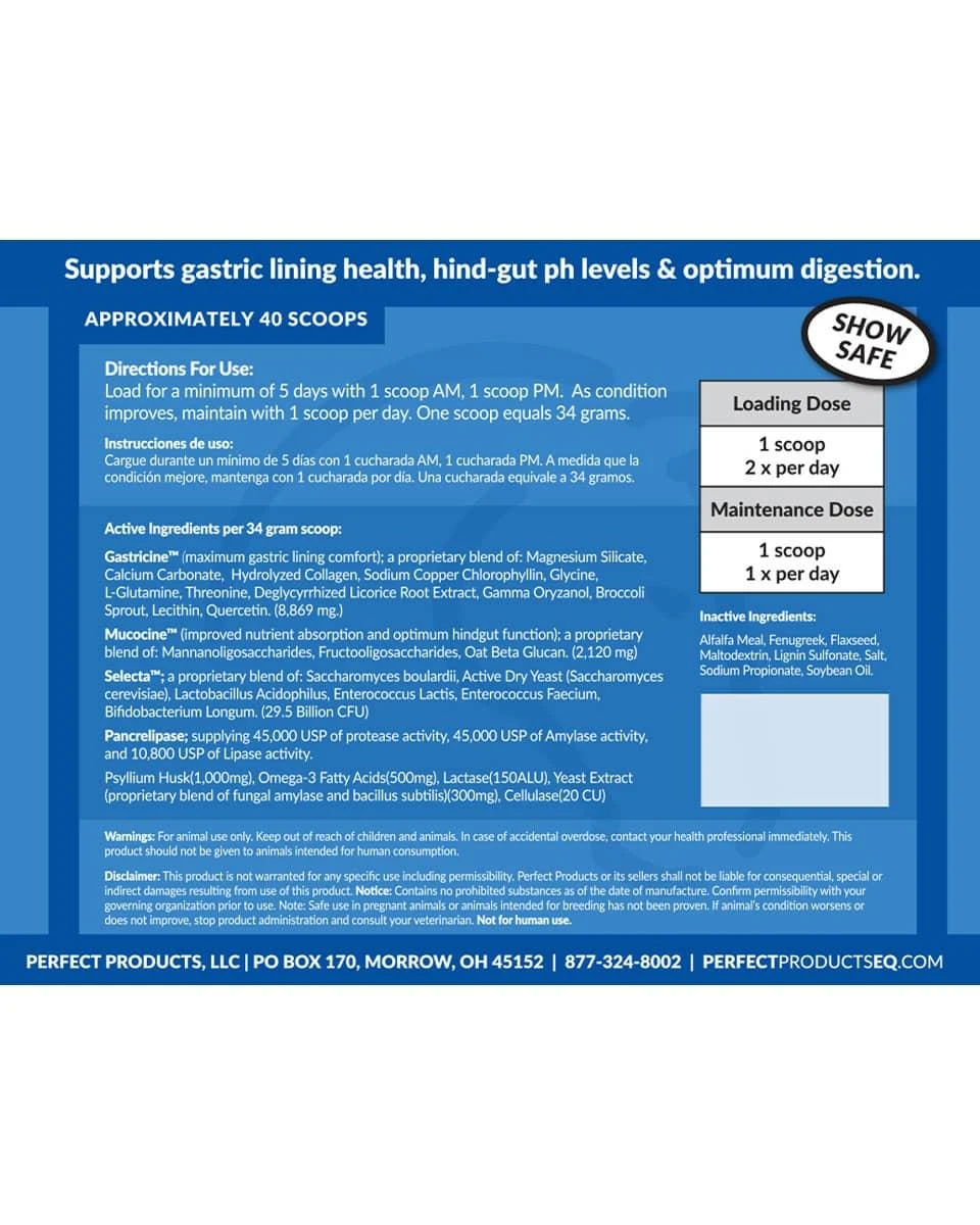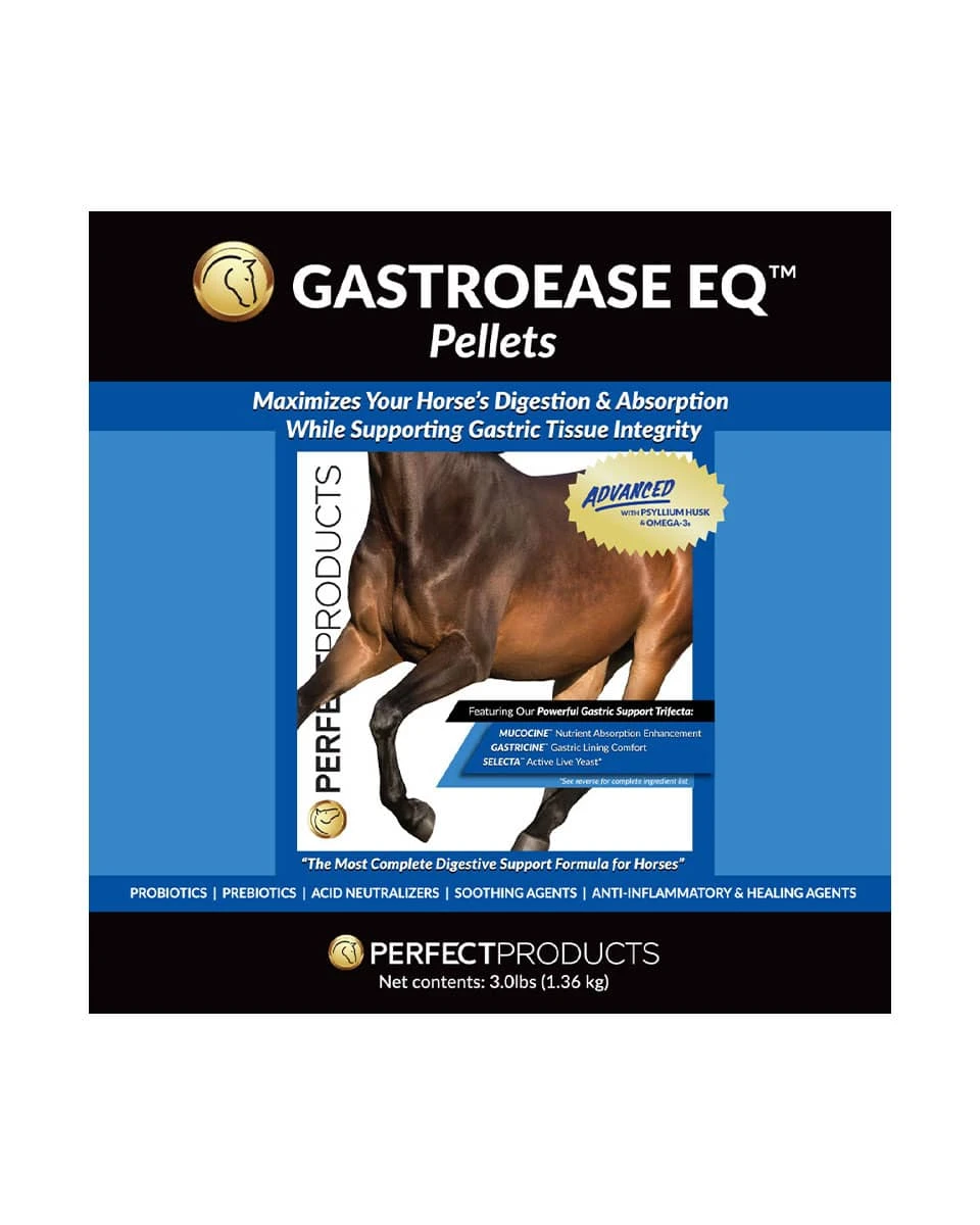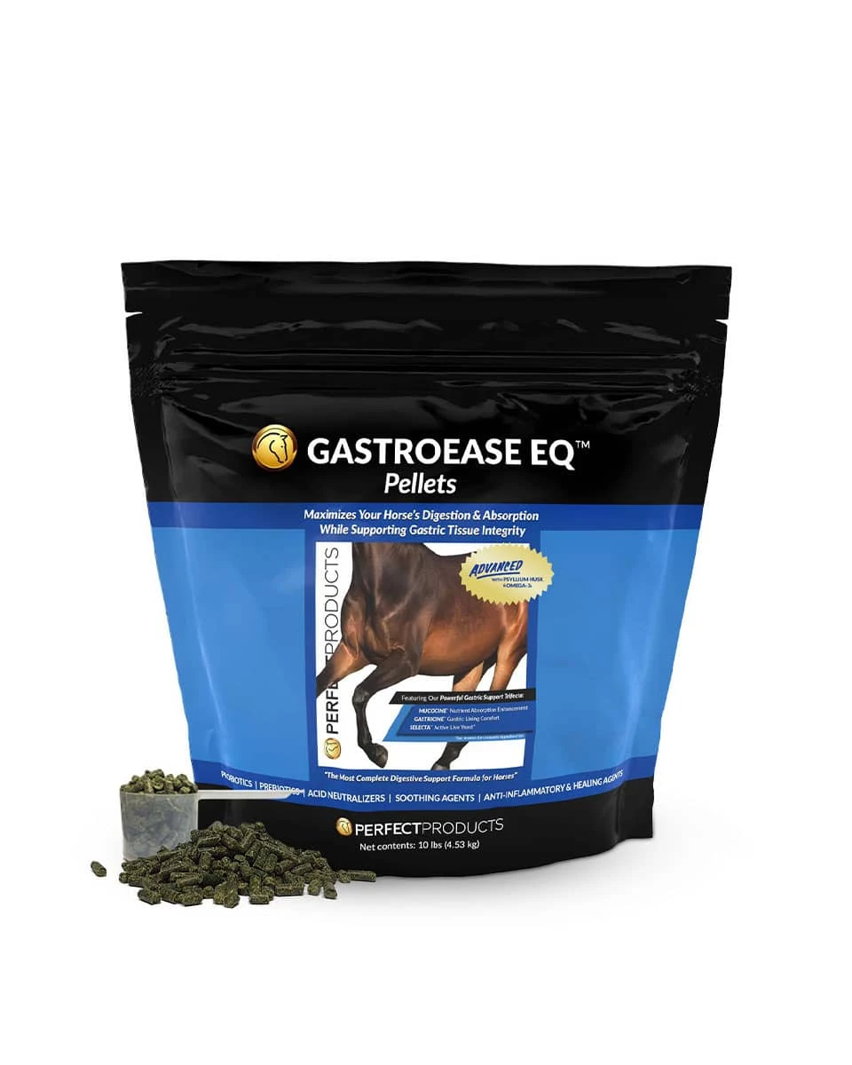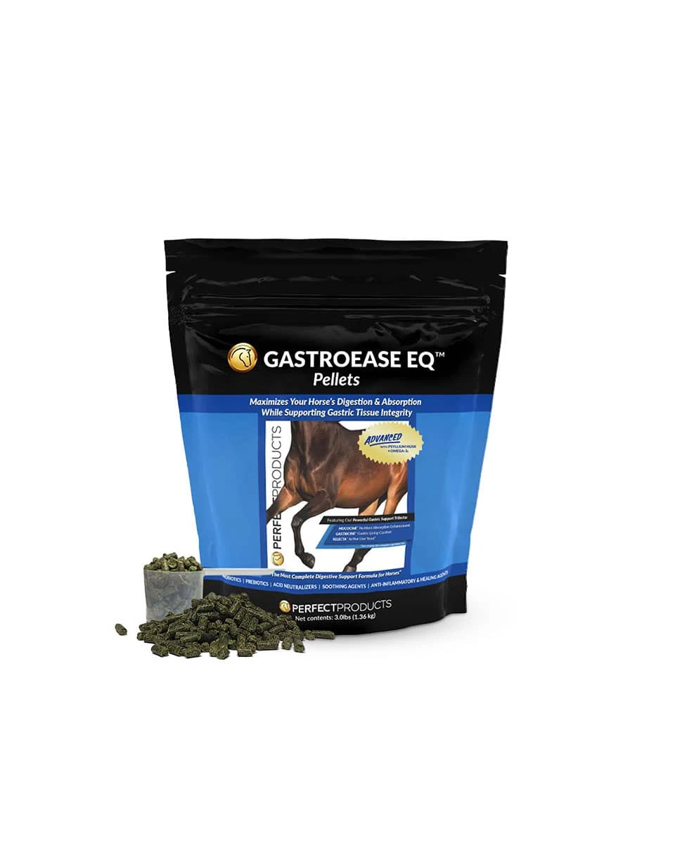 Perfect Products GastroEase EQ Advanced Pellets is formulated to help your horse maintain optimal digestion and absorption, while promoting gastric tissue integrity in horses prone to ulcers. GastroEase EQ supports the protection and healing of at-risk gastrointestinal tissue from the stomach to the hindgut and includes ingredients known to help control the factors contributed to colic and diarrhea.Â