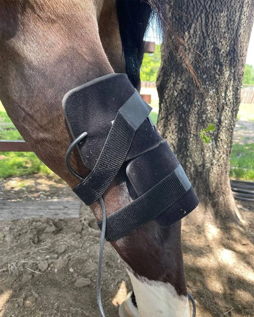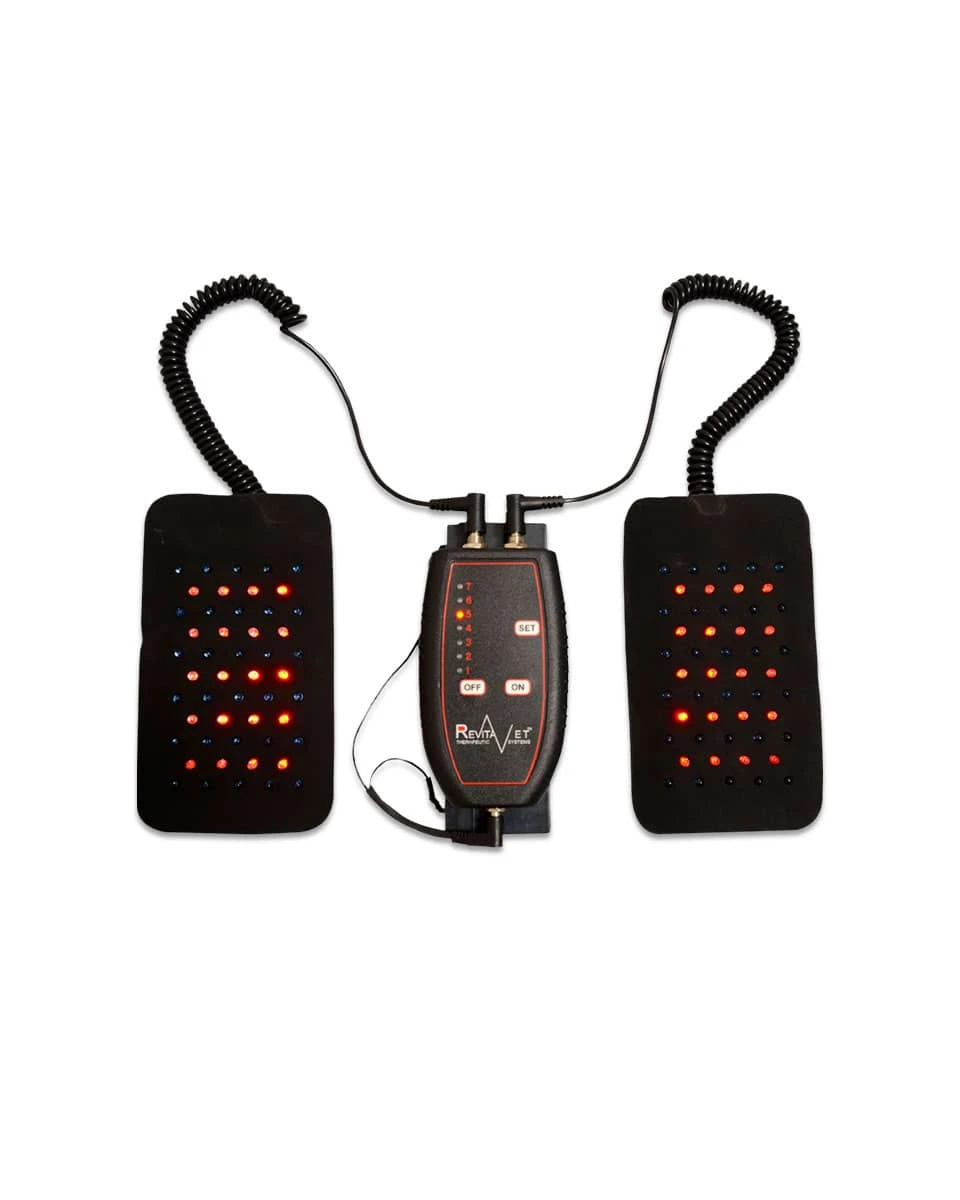 The RevitaVet IR2 from RevitaVet Therapy Systems is a wearable, class 2 laser offering red-light and infrared light therapy for your horse to promote healing for skin lesions and soft tissue injuries. Light therapy with infrared diodes offers many benefits, most notably that it stimulates the release of Nitric Oxide from hemoglobin in the bloodstream. This happens locally when light therapy is applied, and blood flow increases at the same point. Many beneficial chemical reactions happen at the cellular level when the light is applied, which all promote increased healing times. Increased Nitric Oxide in the body increases the body’s anti-inflammatory response, tissue regeneration, and pain reduction. The IR2 comes with a rechargeable battery that lasts for multiple treatments. It will cycle through 7 different frequencies or allow you to set 5-minute increments on specific frequencies, making this a very customizable option for your barn. The unit will come with program suggestions depending on the type of preventative therapy or injury your horse is recovering from. Best of all, light therapy works complimentary to many other therapy modalities, including PEMF. Use this in between stronger laser sessions from your veterinarian to increase the therapeutic benefits your horse is receiving, giving them the best opportunity to recover.