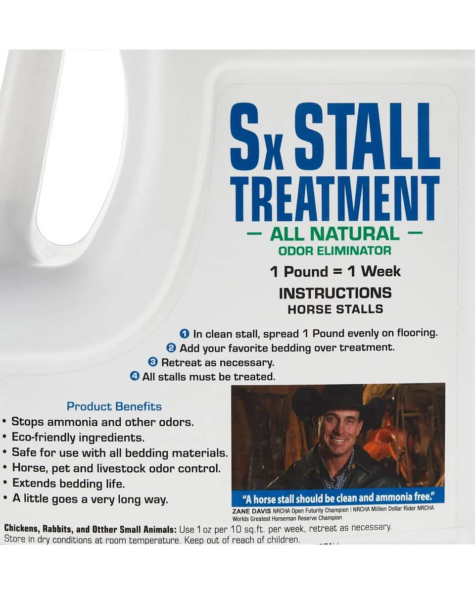 SX Stall Treatment is an eco-friendly odor eliminator safe to use in barns, stalls, and other pet areas. SX Stall Treatment is highly effective at eliminating ammonia and other smells. You don’t need to use very much to improve the area you’re treating, and regular use can help you save on bedding costs.