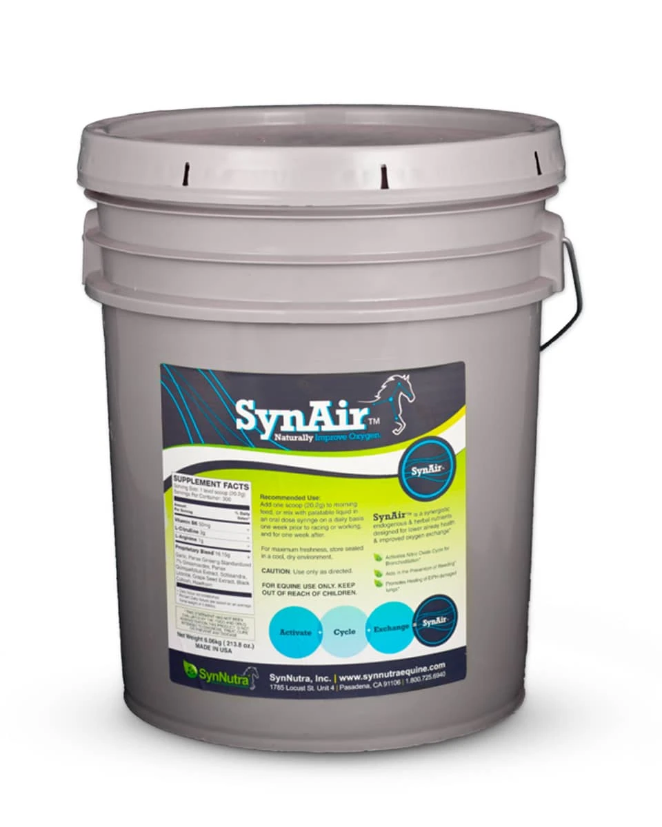 SynAir from SynNutra is designed to help horses at risk of EIPH (Exercise-Induced Pulmonary Hemorrhage.) The SynAir formula works to support healthier lungs, improve oxygen exchange, and aid healing in damaged lungs. If your horse is a bleeder, or has difficulty breathing during or after exercise, SynAir works to treat the bleeding and provide comfort. This product contains no banned substances and is a formula made of herbal and endogenous ingredients.
