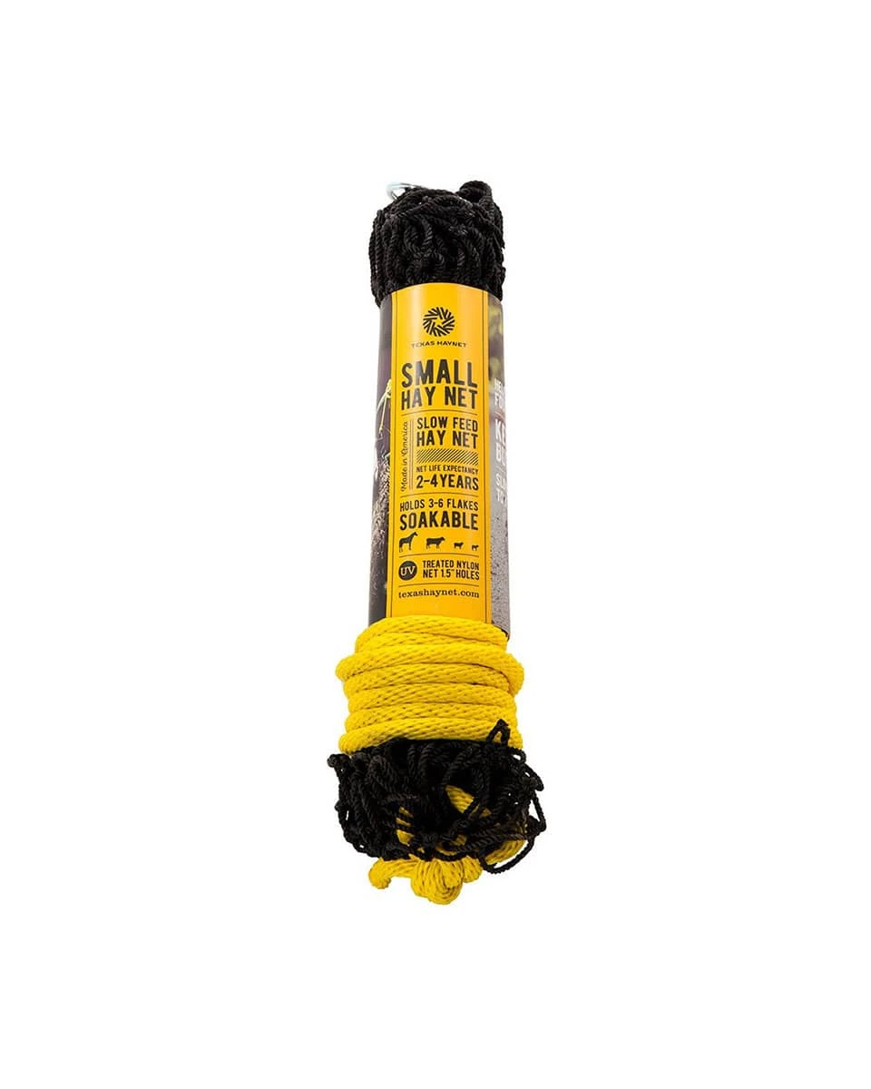 The Hay Net from Texas Haynets is made of UV resistant nylon mesh and makes quick meals, snacks in the trailer and pasture feeding stations a breeze and comes with a heavy-duty carabiner clip for easy hanging. The knotted mesh Small Net has 1.5″ holes and the XS net has 1″ holes. Great for horses, cows, llama, sheep, goats and alpaca.