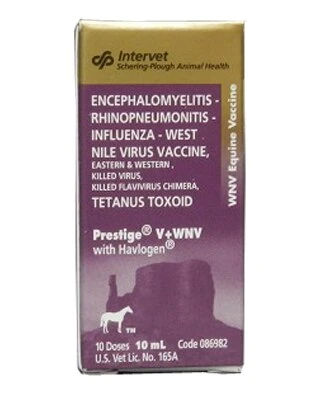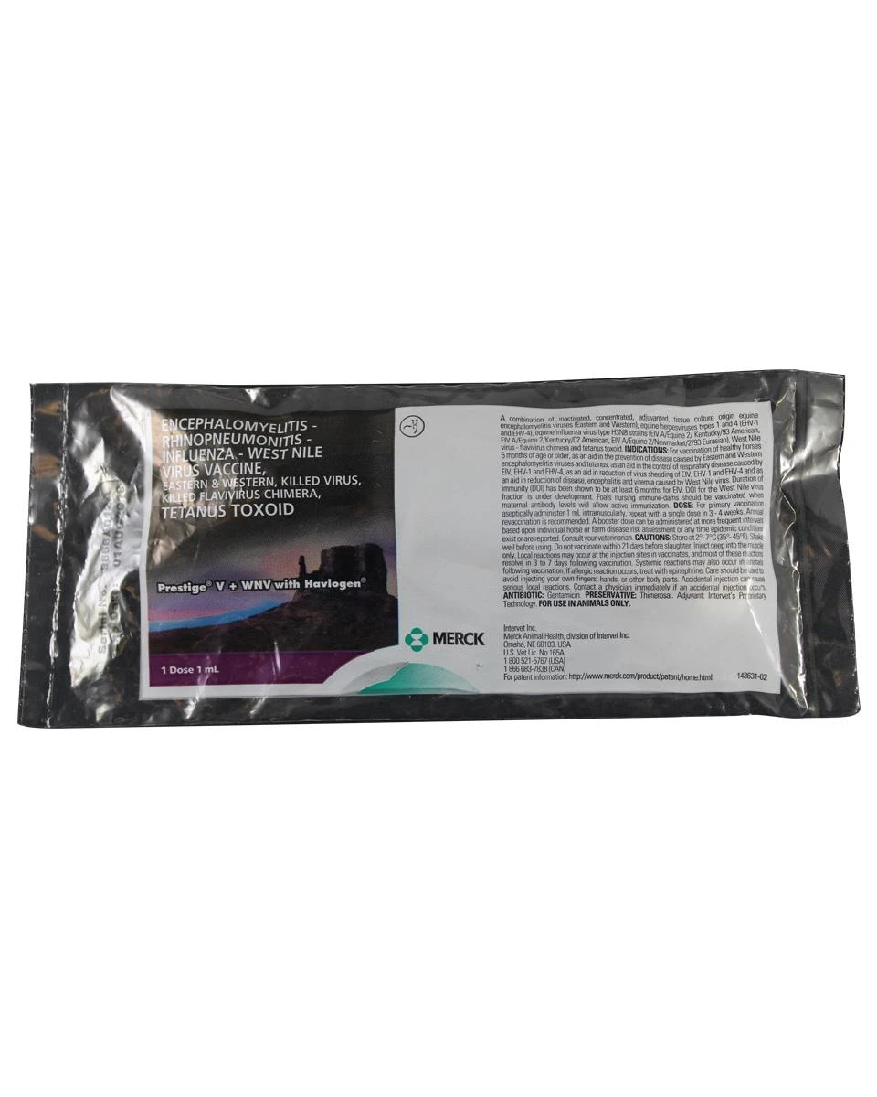 Prestige V+WNV with Havlogen from Merck is for vaccination of healthy horses 6 months of age or older as an aid in the prevention of disease caused by Eastern and Western encephalomyelitis and tetanus. It aids in the reduction of virus and the control of respiratory disease caused by equine influenza and rhinopneumonitis EHV-1 and EHV-4; and as an aid in the reduction of disease, encephalitis and viremia caused by West Nile virus.