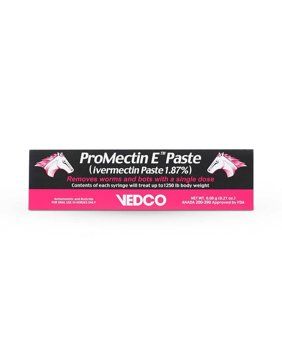 VedCo ProMectin E Paste (Ivermectin) 1.87% is an equine wormer designed to control bots, large strongyles, small bloodworms, roundworms, threadworms, pinworms, lungworms, and large mouth stomach worms. One syringe will treat a horse that weighs up to 1,250 lb. Ivermectin 1.87% is safe for pregnant mares, breeding stallions, and any age of foal.