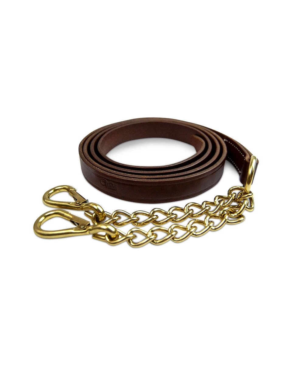 The Leather Jumper Lead from Walsh is made of premium leather for a durable and attractive show-quality lead. The leather portion of this lead is 6’ long and has two split 9” chains on the end, each with a brass clasp. The split chain shanks can be used to clip on either side of the bit or used together like a standard lead. Attractive enough for use in the show ring for in-hand or leadline classes, but durable enough for bringing horses back and forth from the barn.