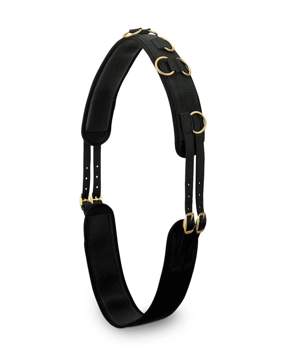 The Neoprene Surcingle can be adjusted from both sides and is designed to be used with long lines, side reins, or other training aids. It’s made from nylon webbing, neoprene padding, and brass-plated d-rings and buckles. The neoprene is easy to wipe down, making clean-up a breeze. This surcingle adjusts to a minimum and maximum size of 68″ and 72″, respectively.