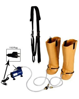 Whirlpool Boots from Jack’s Manufacturing Inc. use hydrotherapy to help reduce swelling and aide in recovery after injury. An industrial compressor aerates the water to provide a massaging effect for the lower legs and hooves. These boots are handmade with soft yet durable vinyl and can be adjusted with different water depths and temperatures to suit your horse’s individual needs. Whirlpool Boots have a quiet motor to help reduce stress in nervous horses.