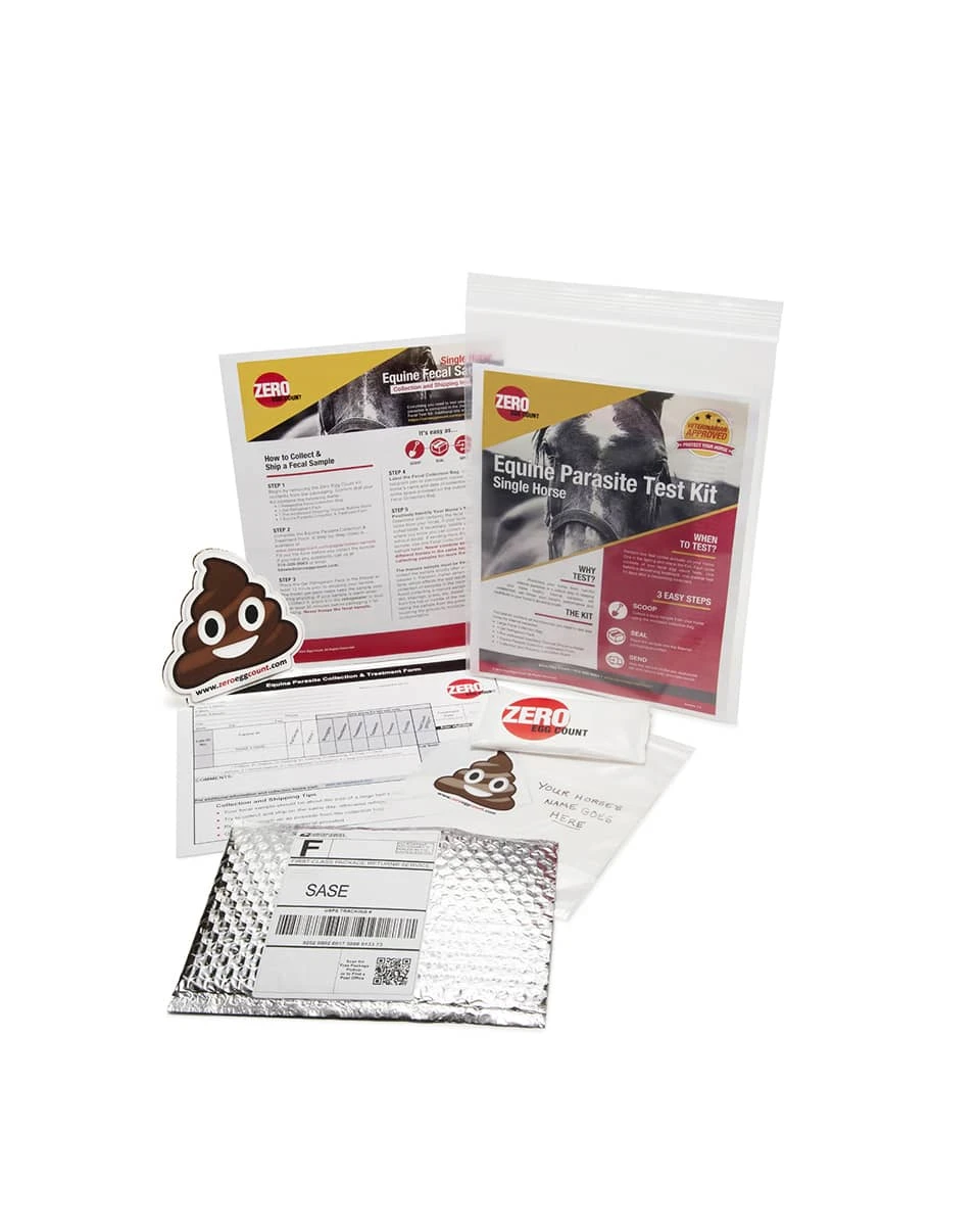 The Equine Parasite Test Kit from Zero Egg Count is a simple test that allows you check your horse for internal parasites. Trusted by both veterinarians and trainers, this test can be performed on horses of any age or breed. The test analyzes a fecal egg count from your horse in order to find their ideal deworming program.